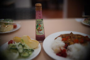 いいたてバージョンのカレー。サラダには飯館の「ナツハゼドレッシング」も!